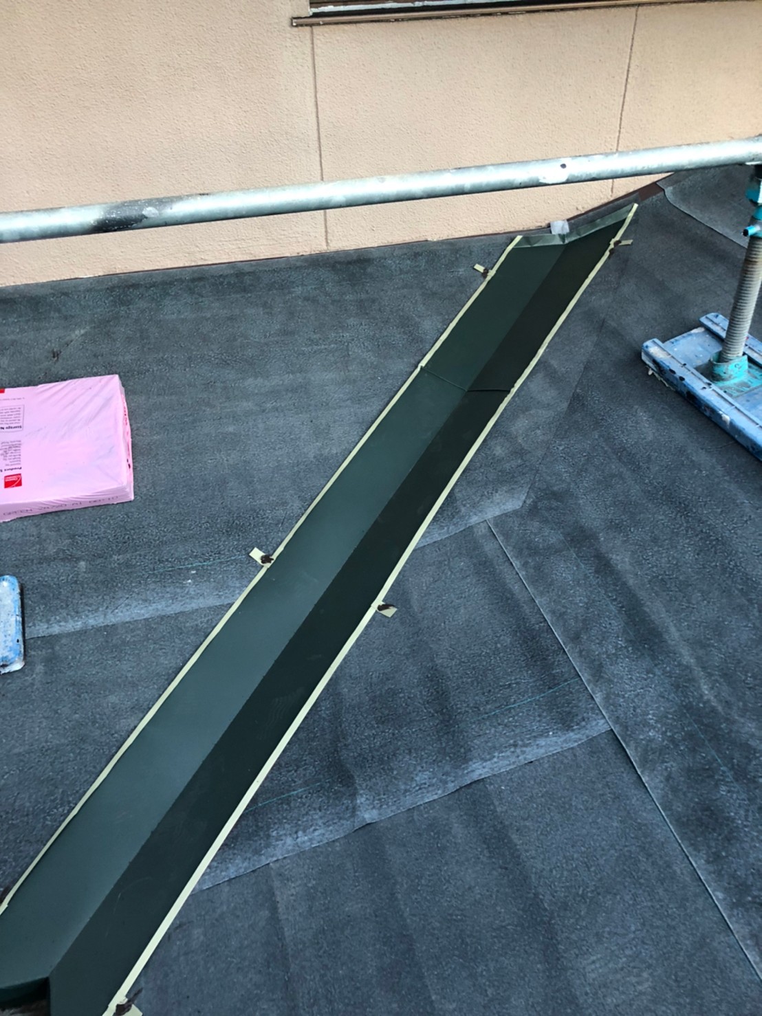 谷部の施工様子です。雨水や雪が谷に流れやすくなっているのでしっかりと捨てとなる谷板金を入れてからシングル材を施工しています。