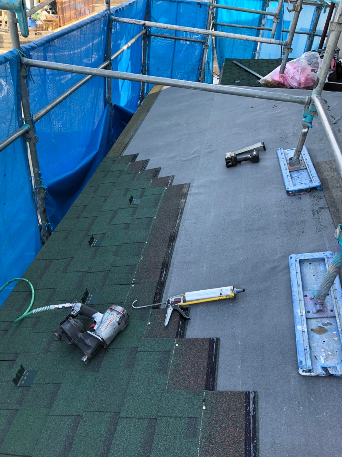 シングル材施工中です。本体材は張る前に軒先にスターターを張ってから本体シングル材を張っていきます。シングル材は専用の機械を使い釘で固定(1枚に4~5本止め)します。釘と併用してシングルセメントを使って軒先から施工しています。