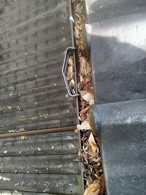 次の写真では、雨樋にも枯れ葉が溜まり流れを阻害している状態が見て取れました。雨樋の詰まりはオーバーフローを引き起こし、外壁への雨だれや軒天の腐食につながることがあります。屋根工事と雨樋の清掃はセットで考えることが大切だと改めて実感できる状況でした。
