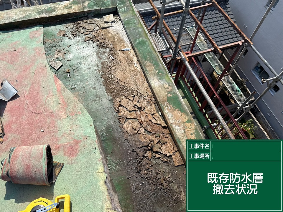 広島市中区、築40年 3階建て屋上 防水工事が開始!劣化した防水層の撤去
