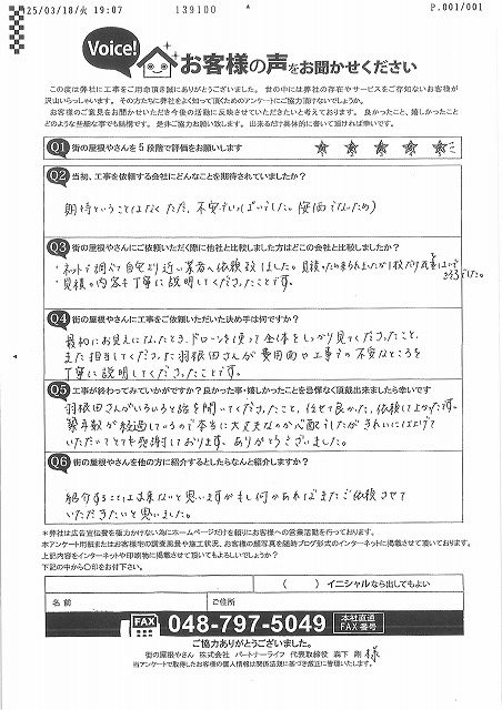 最初にお見えになったとき、ドローンを使って全体をしっかり見てくださったこと。 また担当してくださった羽根田さんが費用面や工事での不安なところを丁寧に説明してくださったことです。