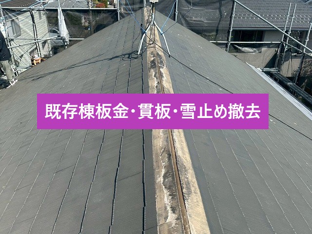 1.棟板金・貫板・雪止め撤去 古くなった棟板金と下地木材(貫板)、雪止め金具を取り外します。 釘の浮きや錆びた部分もしっかり確認します。