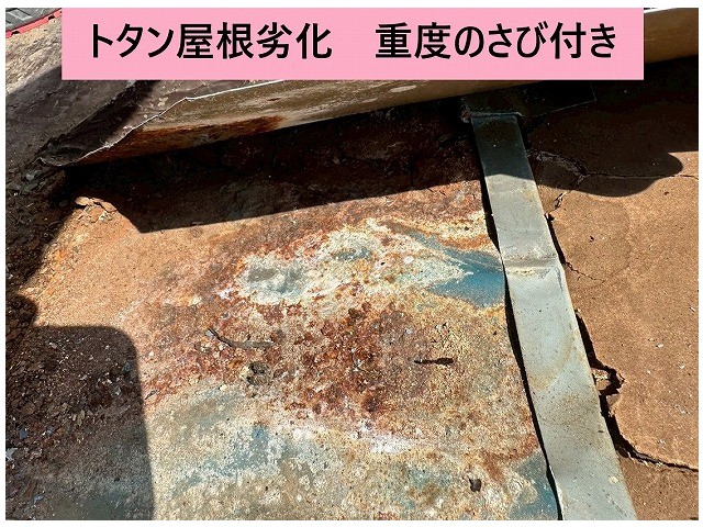 → 長年の風雨によりトタン屋根全体に重度のサビが発生し、一部に穴が開いたことで雨水が内部へ浸入していました。