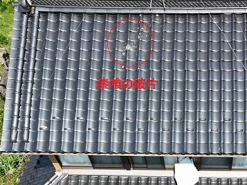 現地に伺うと、お客様が気にされていた「屋根の上の白い物体」は、漆喰が剥がれて落ちてきた破片でした。