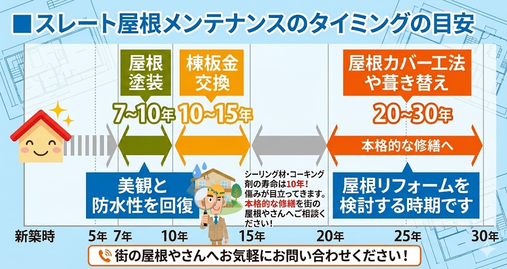 スレート屋根の場合、塗装の耐用年数は一般的に10年〜15年程度といわれており、築15年〜20年前後でメンテナンスが必要になることが多い屋根材です。