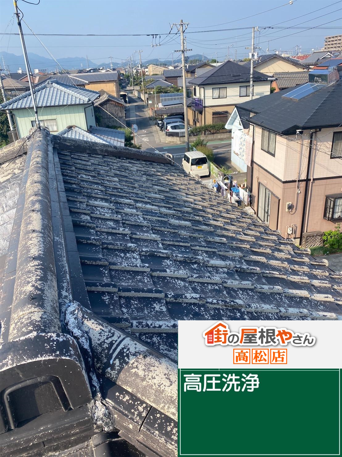 瓦表面に付着しているほこりや汚れ、カビ、藻を取り除くため、高圧洗浄機で洗浄します。