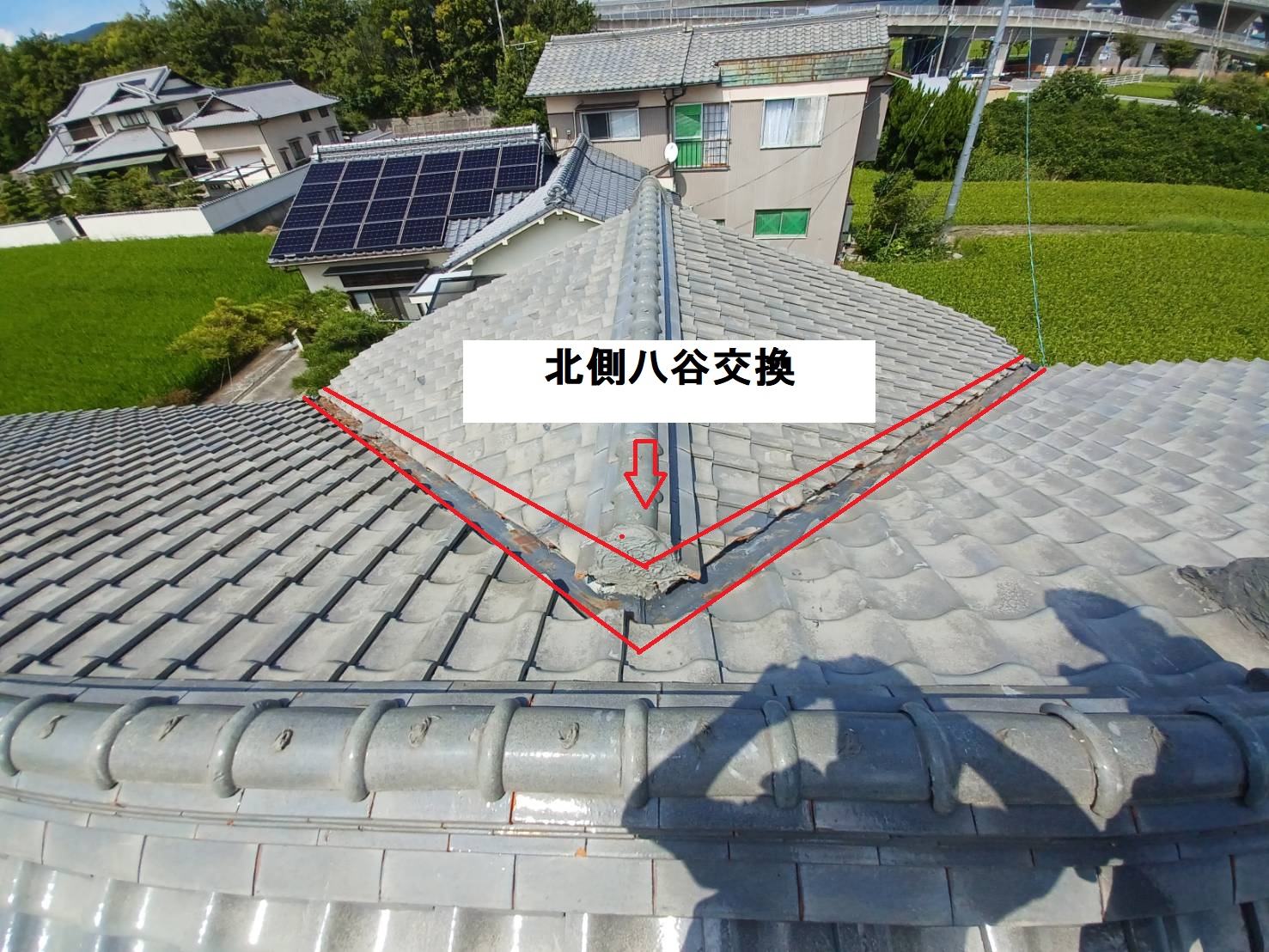 それが「八谷」という部分です。こちらの写真で言うと「V」の形に谷がありますね?谷とは厳密には、雨を処理するために設けられており「谷樋」といいます。瓦を流れてきた雨が谷に流れて横樋喉に流れていくんです!なのでとても大切な部分になります!
