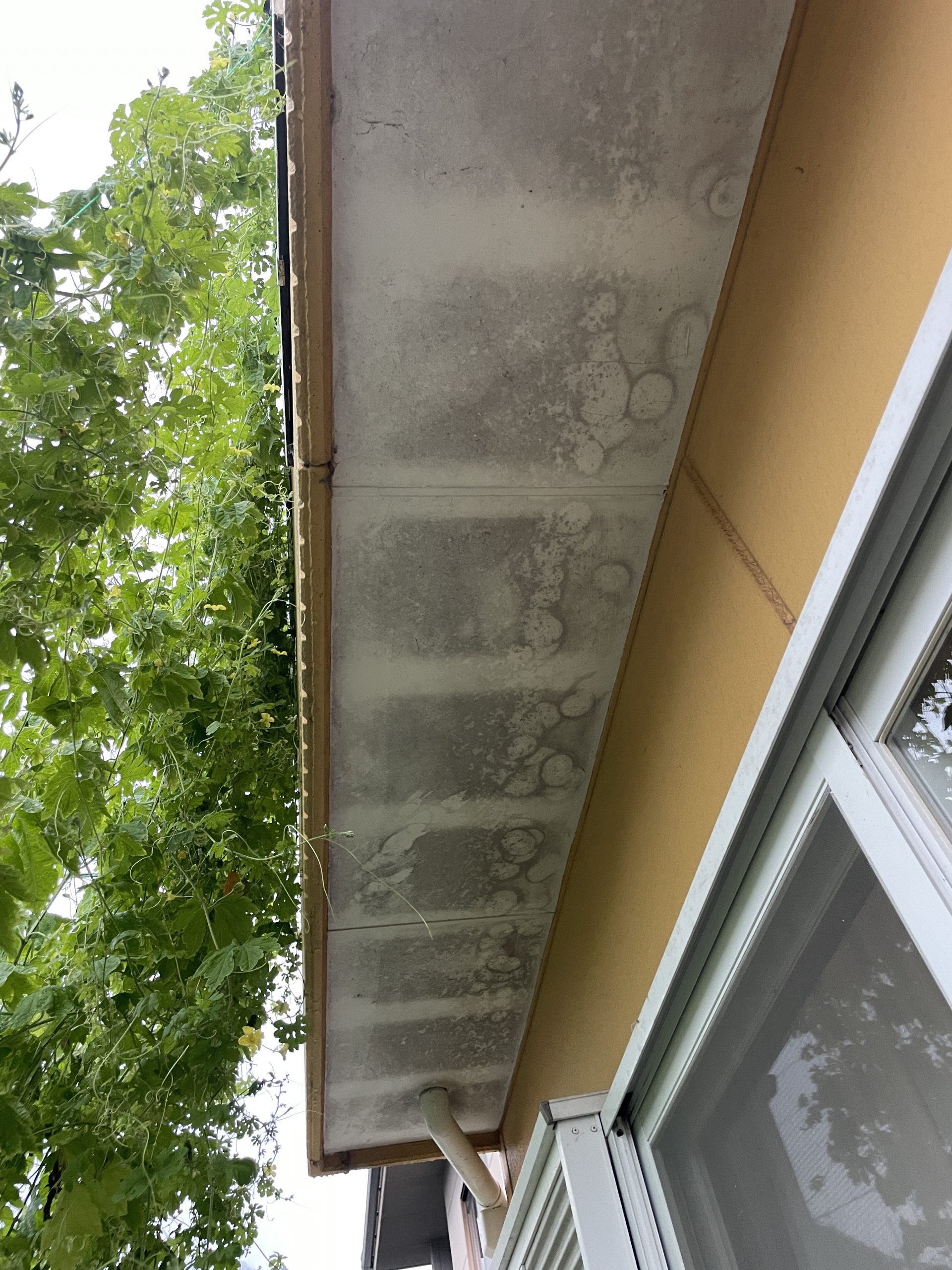 こちらはバルコニーの下ですが、軒天部分に雨染みが出ていますね。