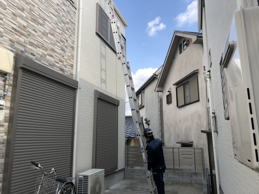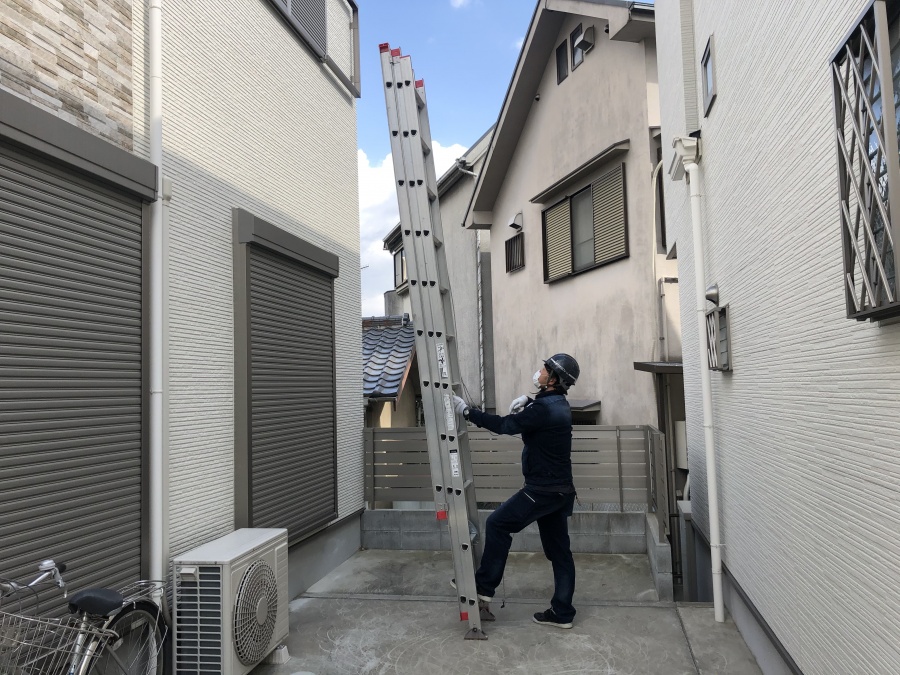 お家の駐車場に梯子をかけさせて頂きました。さっそく、屋根に上っていきましょう!