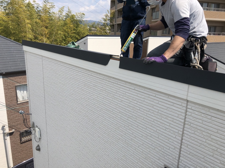 シーリング材を打つことで、板金の重なり部分からの雨水浸入を防ぐのです。