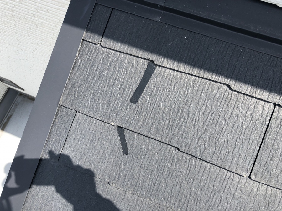 現場調査の際に気になる箇所を応急処置いたしました。黒いテープを張り付けた部分です。
