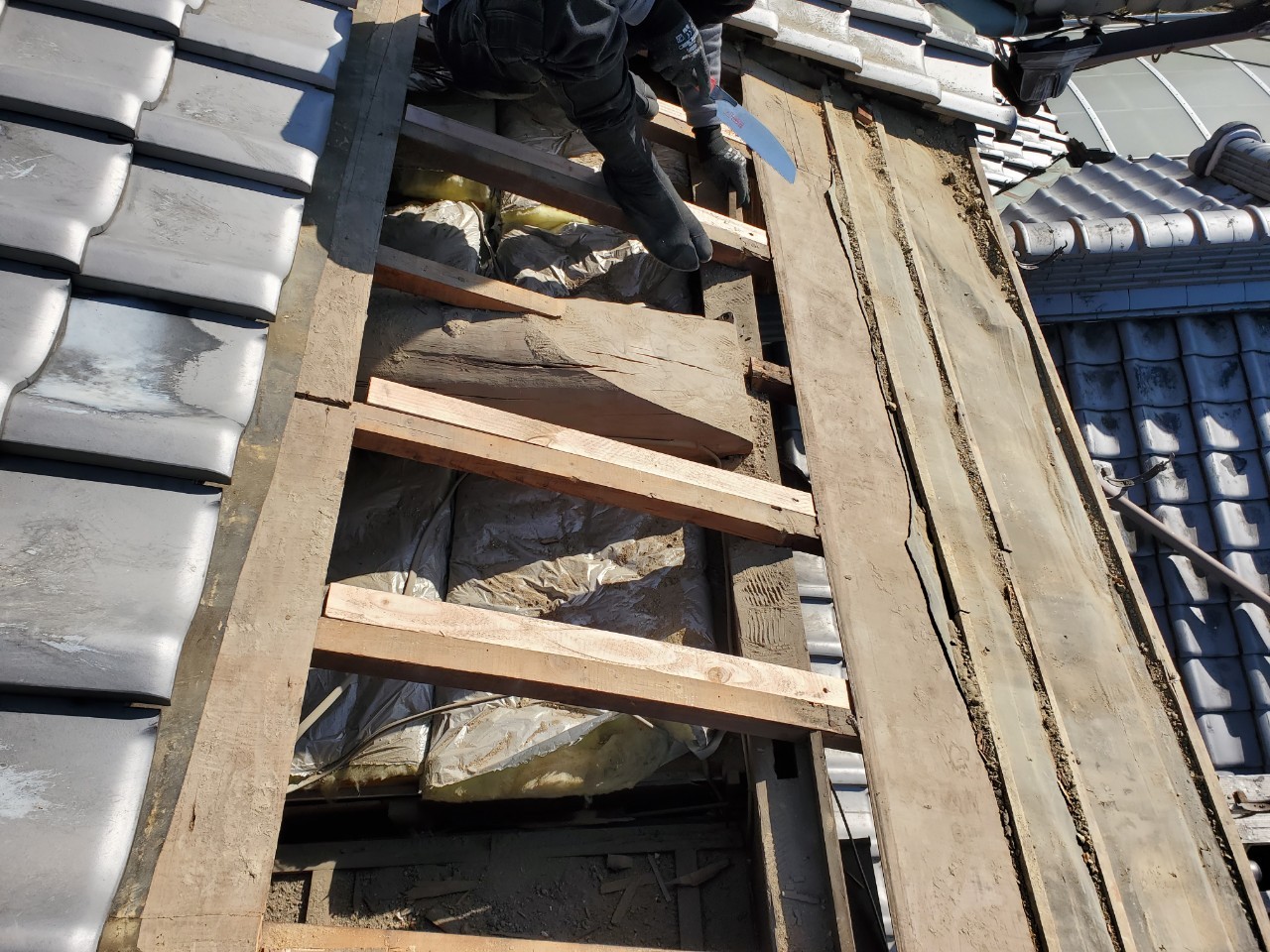 既存の野地板を取り除き、ひび割れた垂木を補強します。