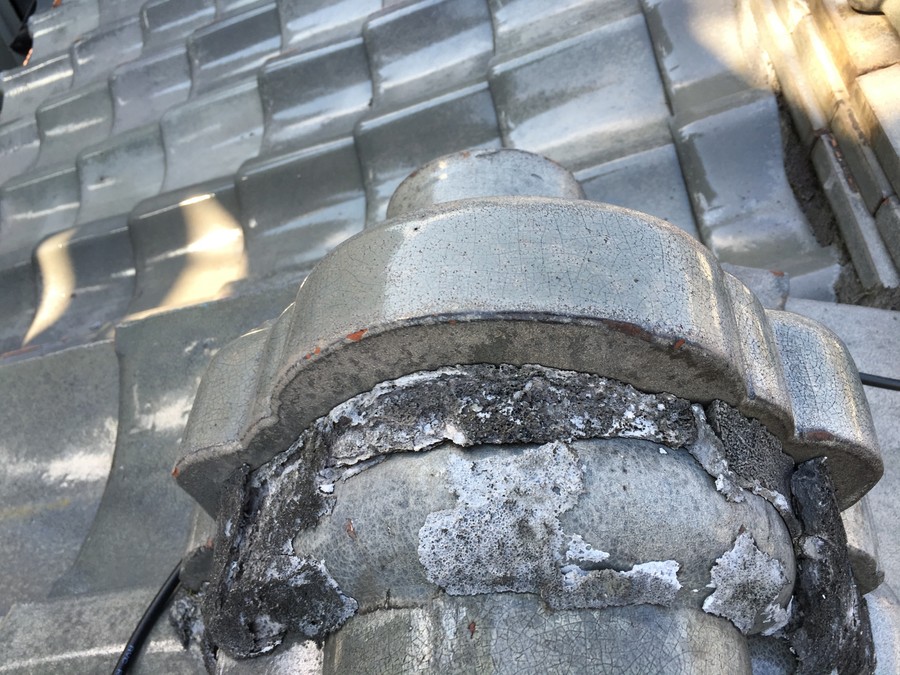 大棟の漆喰が経年劣化により剥がれ落ちています。