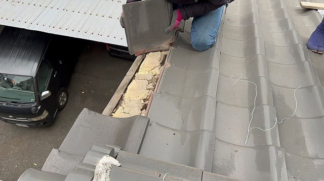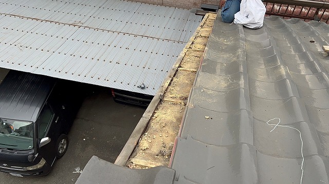 瓦の撤去が終わり、下地として敷いていた葺き土の撤去も行います。葺き土はそのまま撤去せずとも瓦を葺けるのですが、葺き土自体が瓦と同じように本来の位置からズレているため、上から瓦を固定し直してもまたズレてしまいやすいため、ここで葺き土を撤去しておきます。