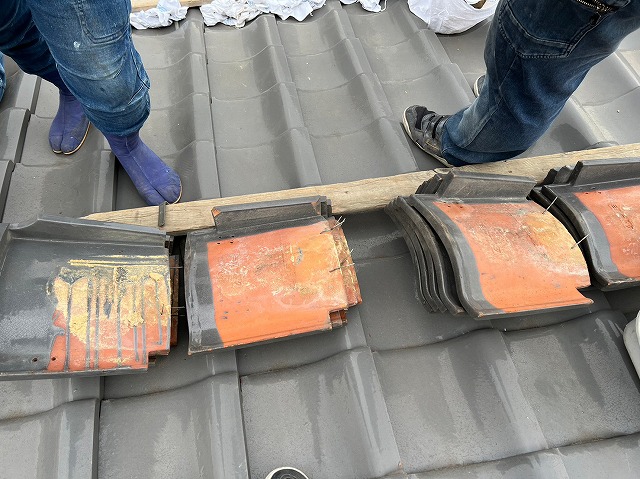 袖瓦は釘で固定されていましたが、台風の影響を受けて全体的にズレが生じていました。釘で固定されているためまだ落下はせずに留まっているような状態です。まずは既存の瓦の釘をはずし、1枚ずつ剥がして先ほどの屋根上の足場の上に仮置きしておきます。