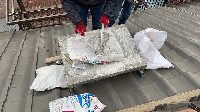 次に、なんばん漆喰を練っていきます。なんばん漆喰とは、従来の石灰を主成分とした漆喰に油脂や粘土、土などを混ぜたものです。従来の漆喰よりも防水性が高く、耐久性も高いため屋根下地であった葺き土の代わりとして、近代の瓦屋根工法で多く使われている漆喰になります。練らずにそのままでも使えるのですが、均等になるよう練り直す事により、瓦を固定する際にすんなりぴったり固定できます。