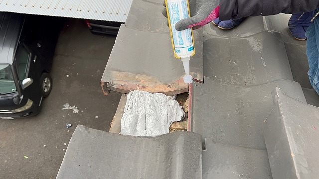 瓦屋根の頂上部分にあたる瓦が積まれた部分を棟(むね)といいます。棟部分に接する袖瓦を一度撤去するとなると、棟も解体しないといけなくなります。そのため、ビスや釘が打てない部分はコーキングによる固定方法で瓦を固定し直していきます。