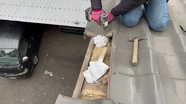 既存の瓦は釘で固定されていましたが、今回はステンレスのパッキン付ビスで袖瓦を固定していきます。鉄よりも耐酸性の高いステンレスにすることで、錆びにくく固定力がキープされやすくなります。また、パッキン付にすることでビスの頭を保護し、ビス穴から雨水を浸入させにくくする効果もあります(*^^*)