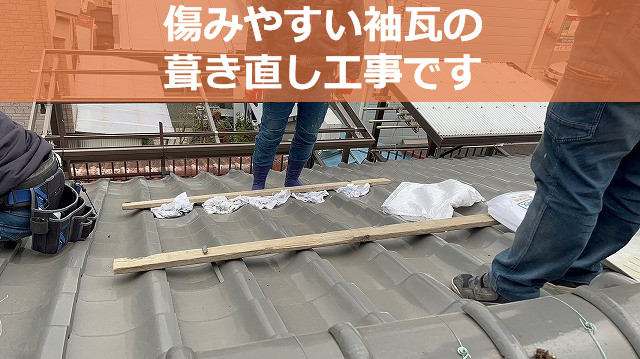袖瓦は、屋根の一番端(ケラバ)に固定されてる瓦のことです。屋根の端から雨水が入らないように、下に垂れがついた形状をしています。まずは瓦屋根上に足場を設置し、資材の仮置き場とします。