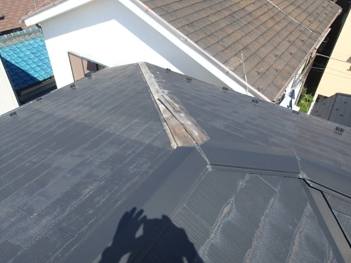 瓦屋根のように雨が棟から入る心配もなく、棟の下には防水シートが張られていますので、全く雨は建物内部に入れません。