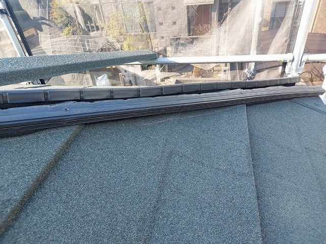 最後に、シールテープと棟用スペーサーを取り付けた後、棟包みを施し、屋根の棟部分を完成させます。