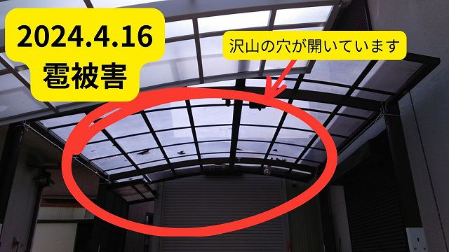 写真はお問い合わせいただいた神戸市西区のお客様宅の被害状況でカーポートに開いた無数の穴の写真です。