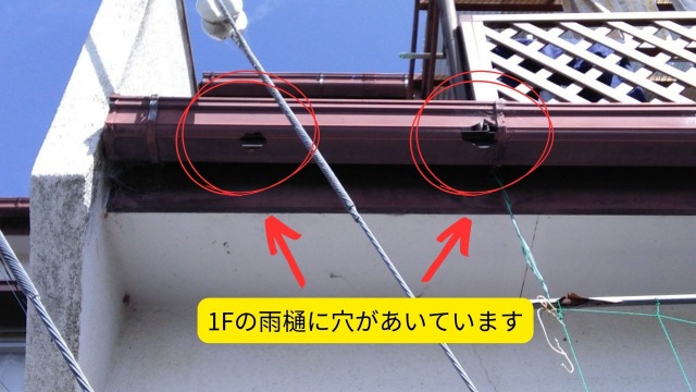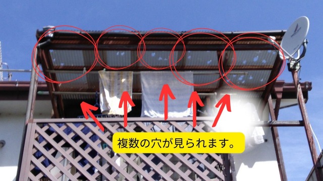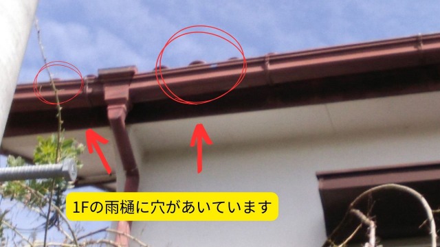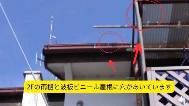 2Fの雨樋と波板塩化ビニール製の屋根には穴があいていました。