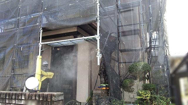高圧洗浄の作業では、ホースが長いため、一人は噴射を担当し、もう一人はホースを持って作業を行いました。