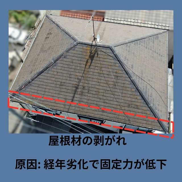 屋根材の剥がれ(剥離):経年劣化で固定力が低下が原因