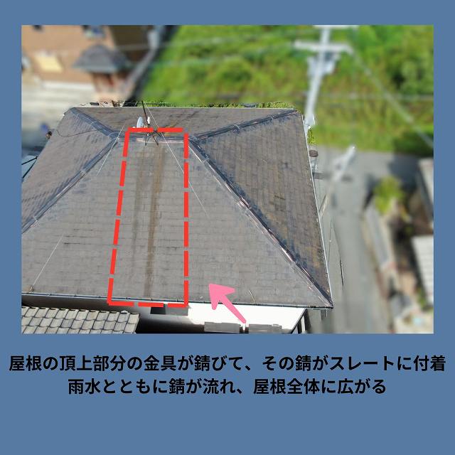 屋根の頂上部分の金具が錆びて、その錆がスレートに付着し、雨水とともに錆が流れ、屋根全体に広がります。