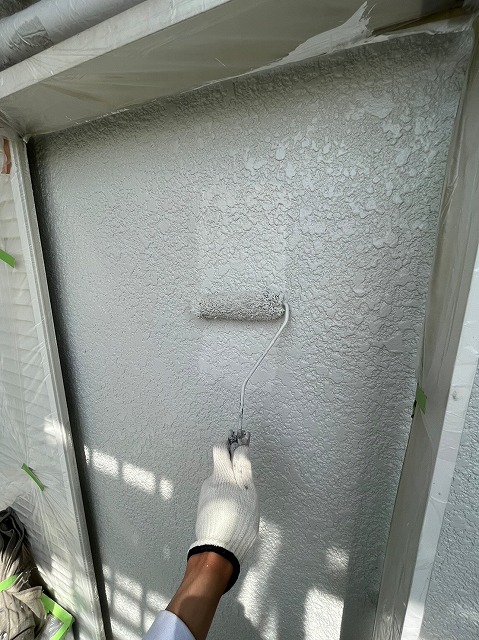次に、耐候性に優れた塗料で 中塗り を行い、塗膜に厚みを出すことで外壁をしっかり保護。
