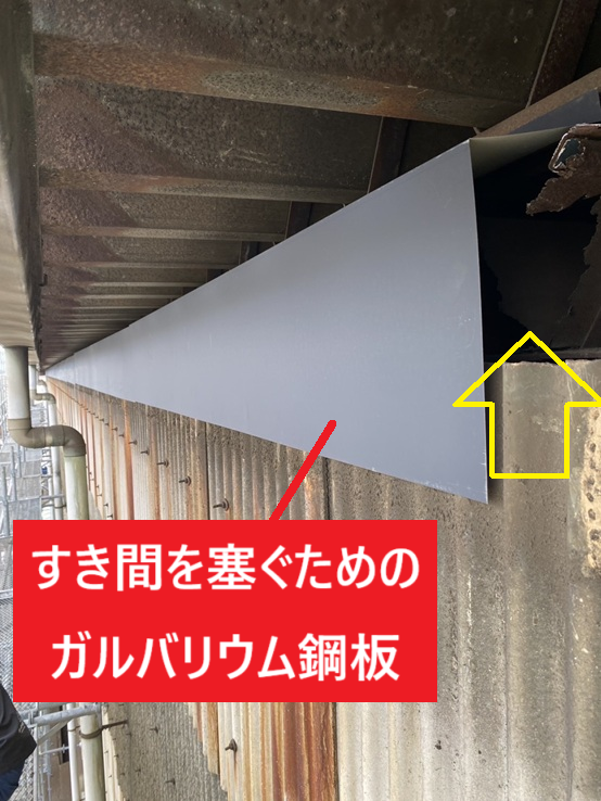 青い矢印はカバー工事を行う前の古い折板屋根です。面戸の設置するために古い雨どいを外す必要があるので(サビがでてもろくなっていました)撤去します。