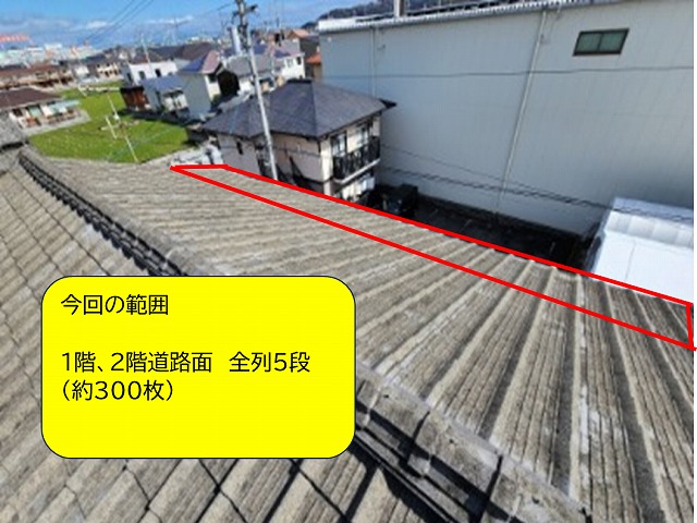 今回、コーキングする補修範囲は1階、2階道路面の軒先全列と軒先から5段分です。枚数にすると