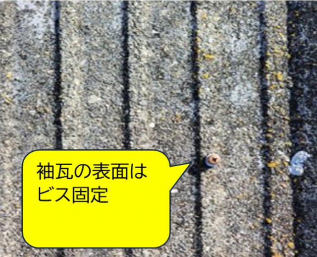 切妻屋根や片流れ屋根は左右両端には袖瓦が施工されています。S型スレートの袖瓦は瓦表面にも釘穴が開いています。端の瓦は風の影響を受けやすいので台風被害など受けやすい部分でもあるので釘の止箇所が多いです。ちなみに和型の瓦は釘穴1か所が多いですが、袖や軒など端っこに使う瓦は釘穴が2つ付いています。*商品によって異なります。今回施工内容外だったのですが、一緒にやっておきました。ワッシャー付きビスとコーキングで2重防水です。表面の凹凸の凸部分に穴がありますが、全く雨水が入らないわけでもないので塞ぎましょう。穴があったら雨水も入りたい。