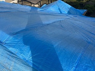 ルーフィングを張り終えたら、ブルーシートをかけて養生します。