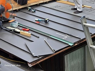 立平板金を葺き、ハゼを1枚ずつ締めていきます。