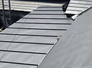 上屋根の下へ潜り込むように取り付けられた立平板金の上端部分です。