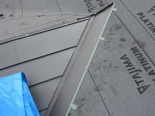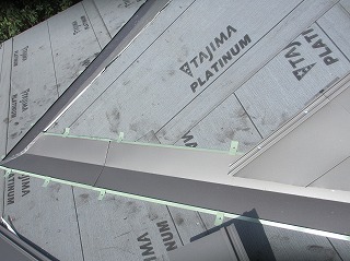 この後、防水のためのシーラーを貼り、谷コーナーメタルを取り付けます。