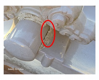 鬼瓦周りの漆喰も同様に、経年劣化による剥がれやヒビが見られました。