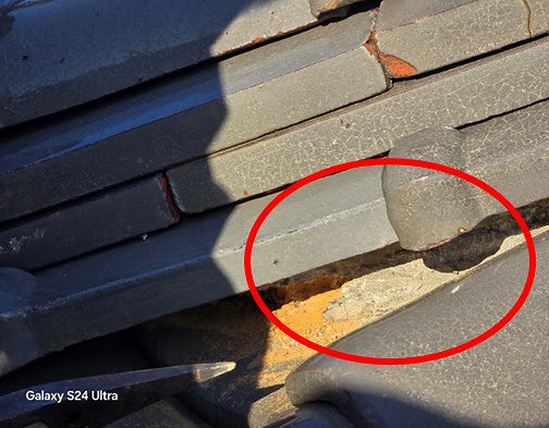 先程の2番の理由(雨漏りリスク)は中々イメージしにくいですね。同じ箇所の写真(左)と以前、別現場で撮影した写真(右)並べてみました。面戸漆喰の上に積まれている「のし瓦」ですが、