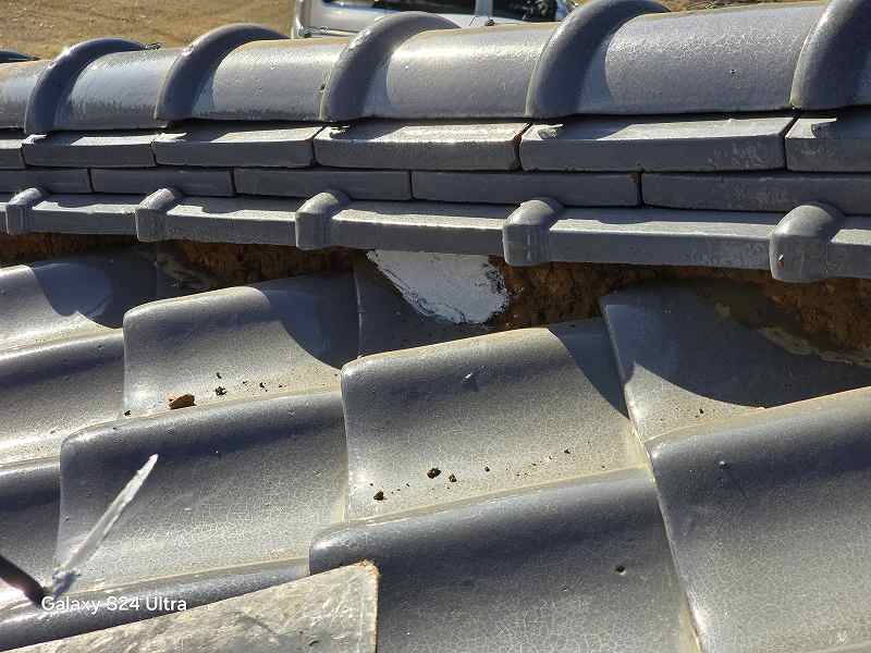 写真のように新しい漆喰を塗ったのに古い漆喰が既に見えていたり、雨水が内部侵入して面戸漆喰の上側に苔が生えてしまう状態になっていました。*イメージしやすく、別現場写真を使用してます。この現場の文章解説ではありません。
