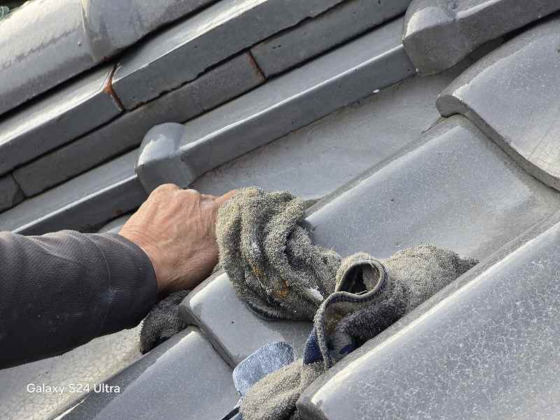 塗り終わった箇所の瓦を拭き掃除。どうしても瓦正面に漆喰が付く場合がありますので、