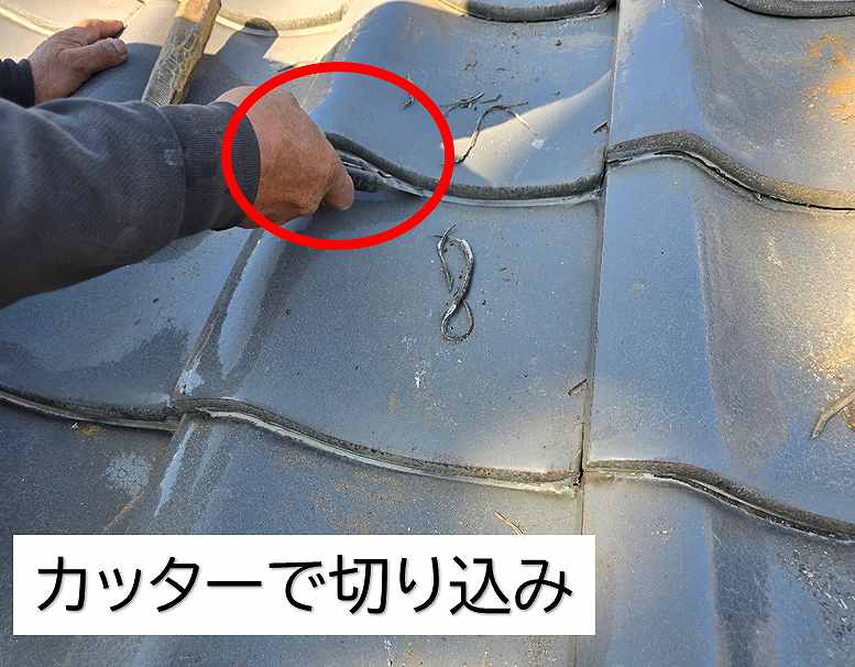 切れ込みを入れて上下の瓦が分かれるようにします。切れ込みを入れただけでは、表面などにコーキングが残っています。