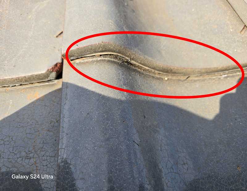 和型瓦の「高さが1番低い部分」までコーキングを除去した写真です。この1番低い部分が「雨水が集まって流れる場所」になります。コーキングを切った瞬間に隙間から溜まっていたゴミがバラバラと落ちてきました。