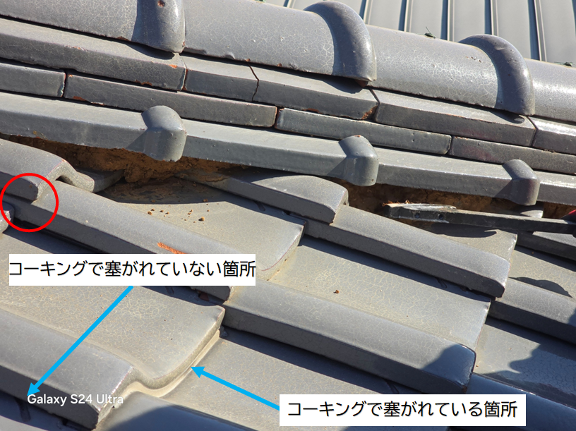 横から見た写真です。コーキングがまるで「土手」のように瓦の隙間をがっちりと積止めてしまっています。