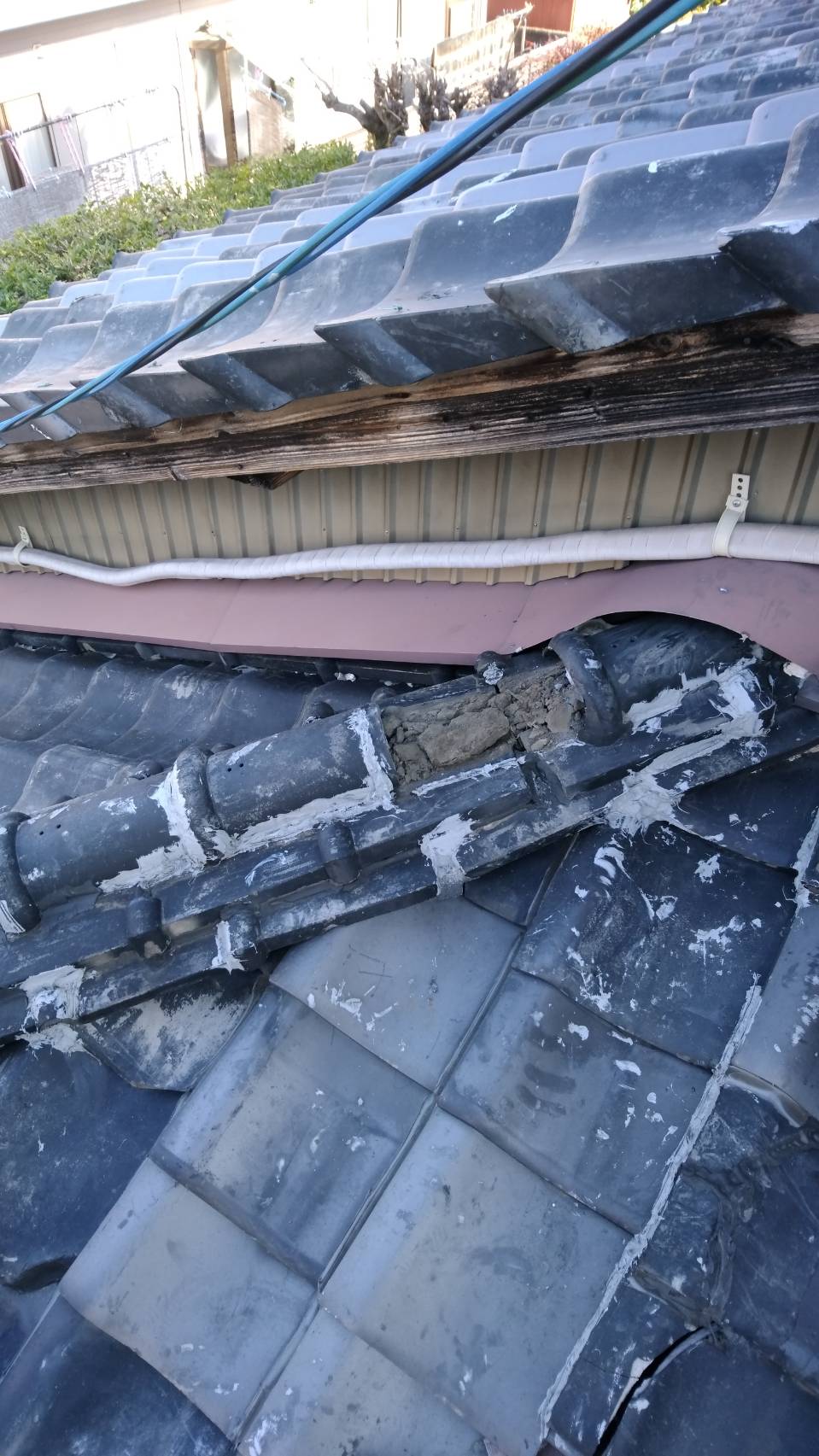 瓦屋根のお宅の棟瓦の破損。土で固定してあった中身が粉々で崩壊していました。 昔は瓦を乗せる時に『土葺き工法』という土を粘土上にした湿 ...続きを読む2024/03/24 静岡市駿河区、木造2階建て住宅の屋根を軽量瓦で葺く工事を行っています