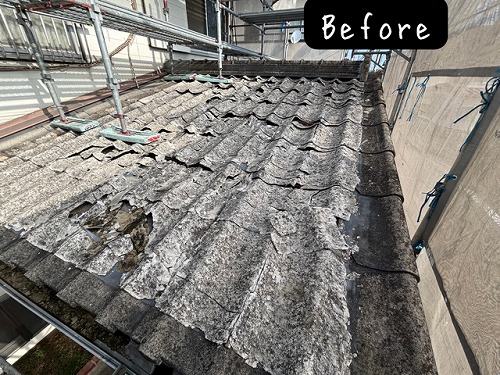 「二階の波板が古くなって、茶色く変色してるんです。強い風が吹いた時、飛んでいかんか心配やから、張り替えてください」以前、水廻り入替等の工事をしていただいたI様のご相談で、二階のテラス屋根の劣化した波板を張替えることになりました。I様邸の波板は塩化ビニール製の波板で、劣化すると変色し、劣化が進むと ...続きを読む2025/11/19 岐阜市でスレート屋根をスーパーガルテクトでカバー工事!工事の前後を比較