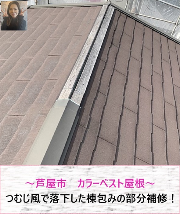 こんにちは。街の屋根やさん名古屋南店です。 前回のブログでは、日進市の住宅建物塗装工事において実施した、シャッターボックスや庇板金などの屋外鉄部への塗装の様子をお伝えいたしました。 今回は、大屋根の谷板金や下屋根の雨押え板金に対する塗装工程について、その施工の様子をご紹介したいと思います。 ...続きを読む2025/11/4 芦屋市 つむじ風でカラーベスト屋根の棟包み板金が落下し、部分的に補修【サキブログ】