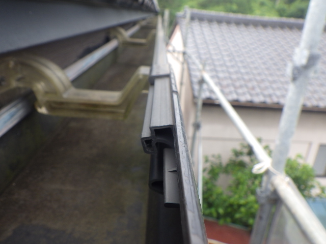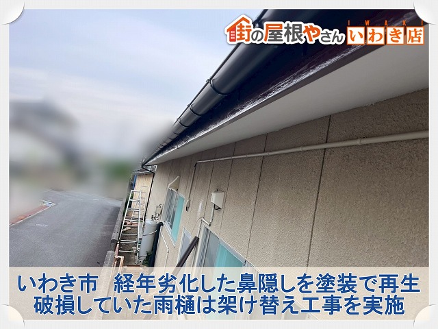 宇都宮市で落ち葉除けネットエスロネットを取り付けました 施工前の軒樋内の状態です 風が吹くと近隣の雑木林から落ち葉が飛んできて軒樋にいっぱい溜まってしまうそうで 軒樋に落ち葉が入 ...続きを読む2025/10/31 いわき市にて塗装が剥がれた鼻隠しの塗装工事と雨樋架け替え工事を実施