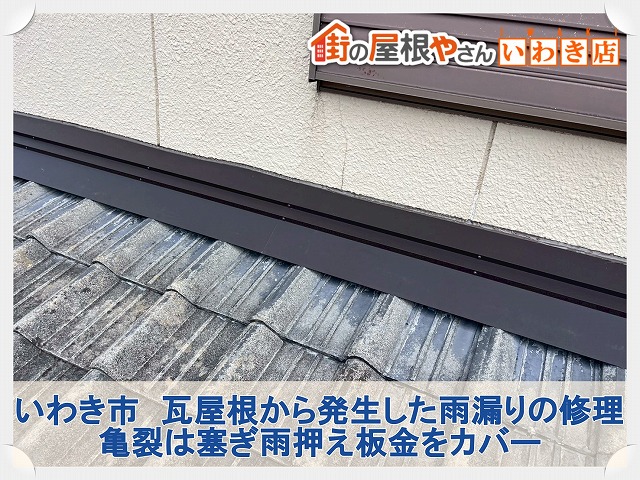 小山市のみなさん、こんにちは。街の屋根やさん栃木小山店です。本日は、室内雨漏りの無料調査をお届けします。屋根が原因で室内雨漏りが発生した場合、屋根材が疑われますが、実は防水紙の劣化が見落とされがちなんです。ところで、防水紙が劣化すると、なぜ雨漏りにつながるのでしょうか?屋根と雨漏りの関係を詳しく解説しますので ...続きを読む2025/10/31 いわき市にて雨漏りした瓦屋根の修理工事。雨押え板金を被せ雨漏りを防止